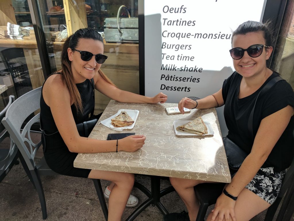 We had worked out that we needed to catch the 106 bus for Riquewihr, so we headed to the Tourist office to get directions. On the way, we found and met one of the day’s minimum requirements – French Nutella Crepes. The girls were in heaven!