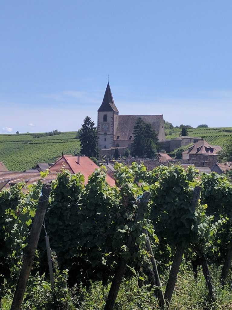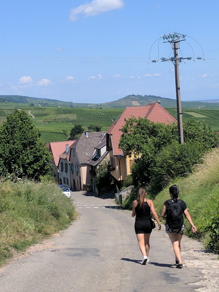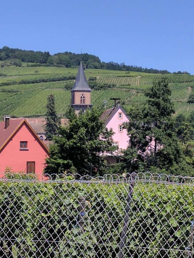 We enjoyed just walking around the streets and into the win tasting rooms. After about an hour’s exploring, we sat down at D’Brendelstub for a light lunch. After lunch, we assessed our options. The next bus was not until 5pm and we really wanted to see Ribeauville. So we started walking. The road through the vineyards was long, but fairly flat.