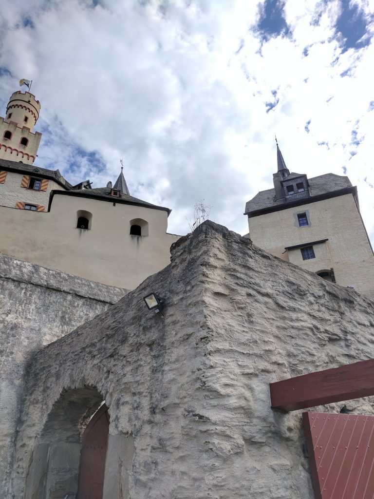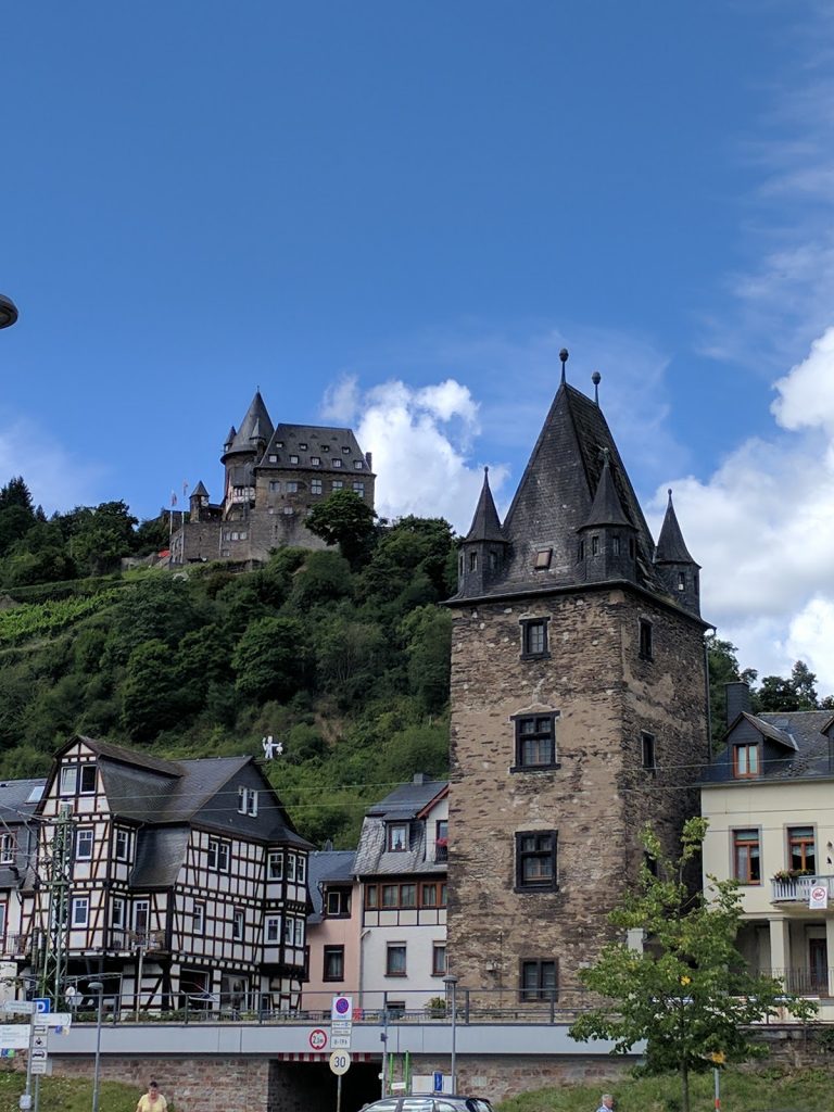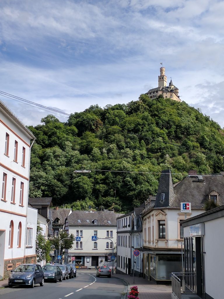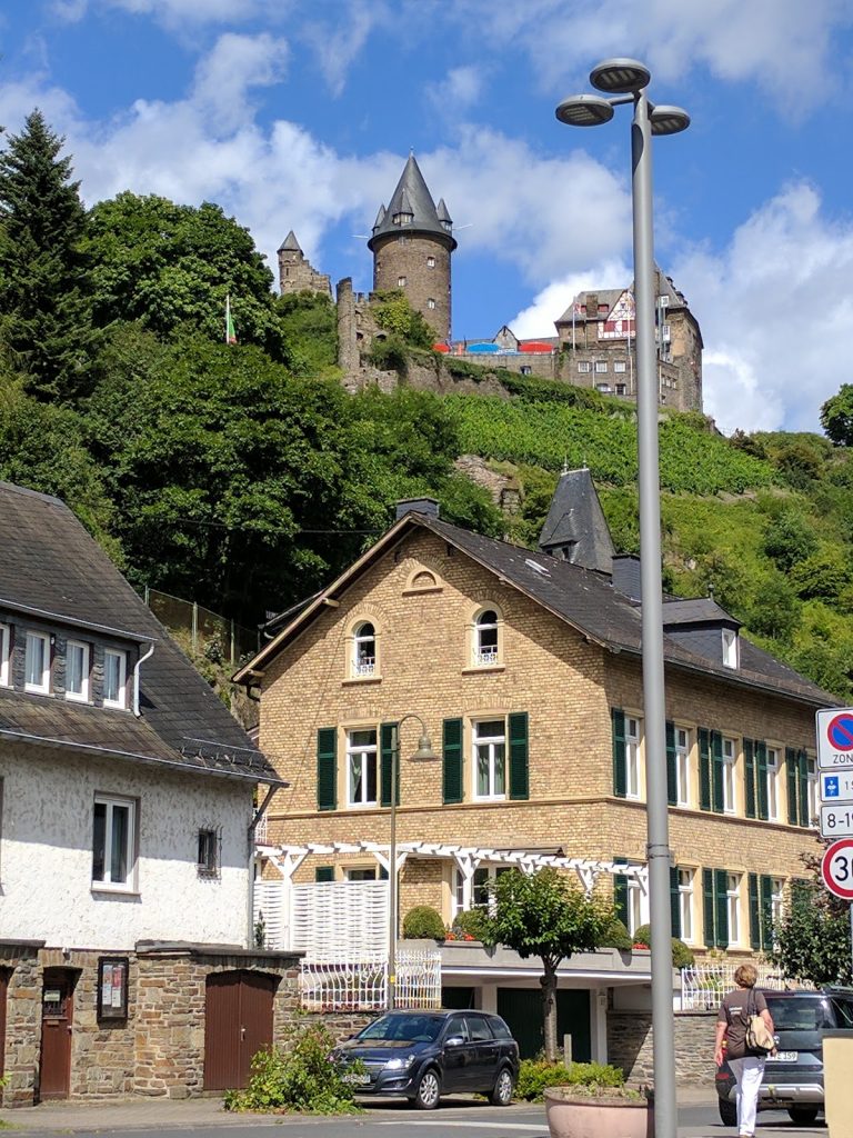 We were not keen to walk up to the castle, and taxis were scarce, so we caught the ferry across the river to Sankt Goarshausen, then walked to the train station to ride up the eastern bank to Braubach. Braubach is best know for Marksburg, the best preserved castle on this stretch of the Rhine. We wandered around the streets, and had a gelato, looking for a taxi to take us to the top.