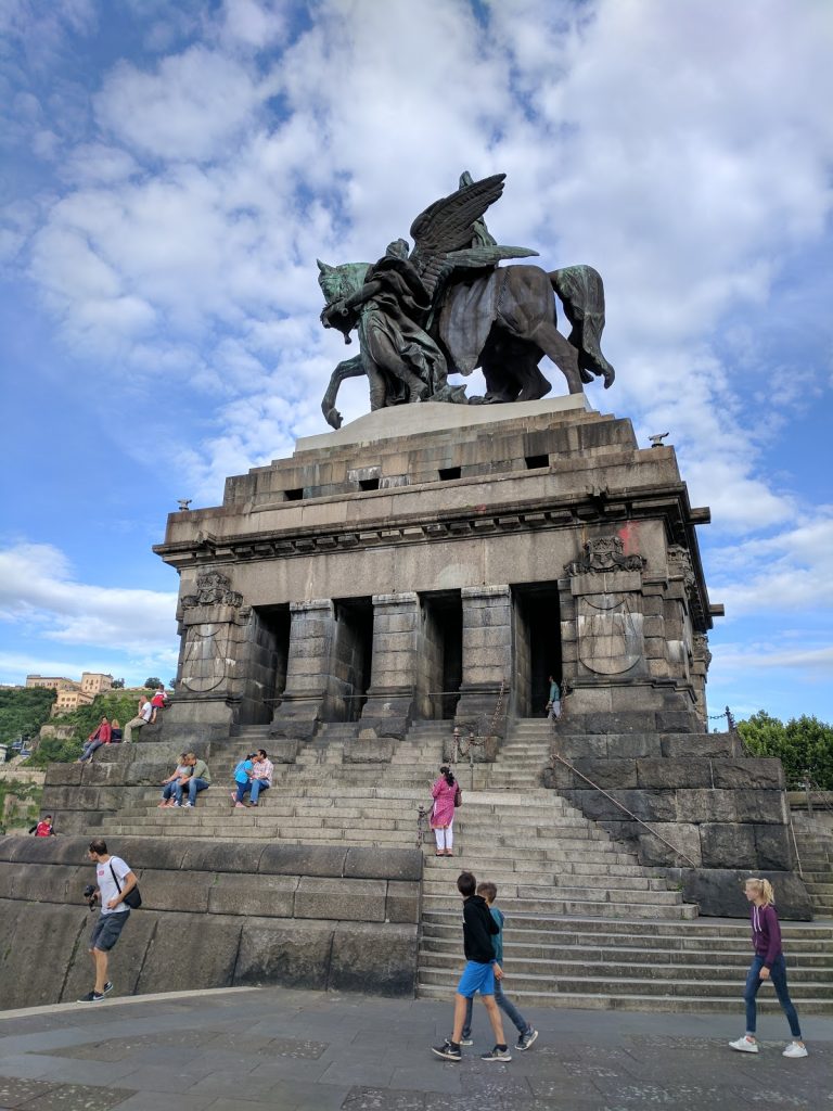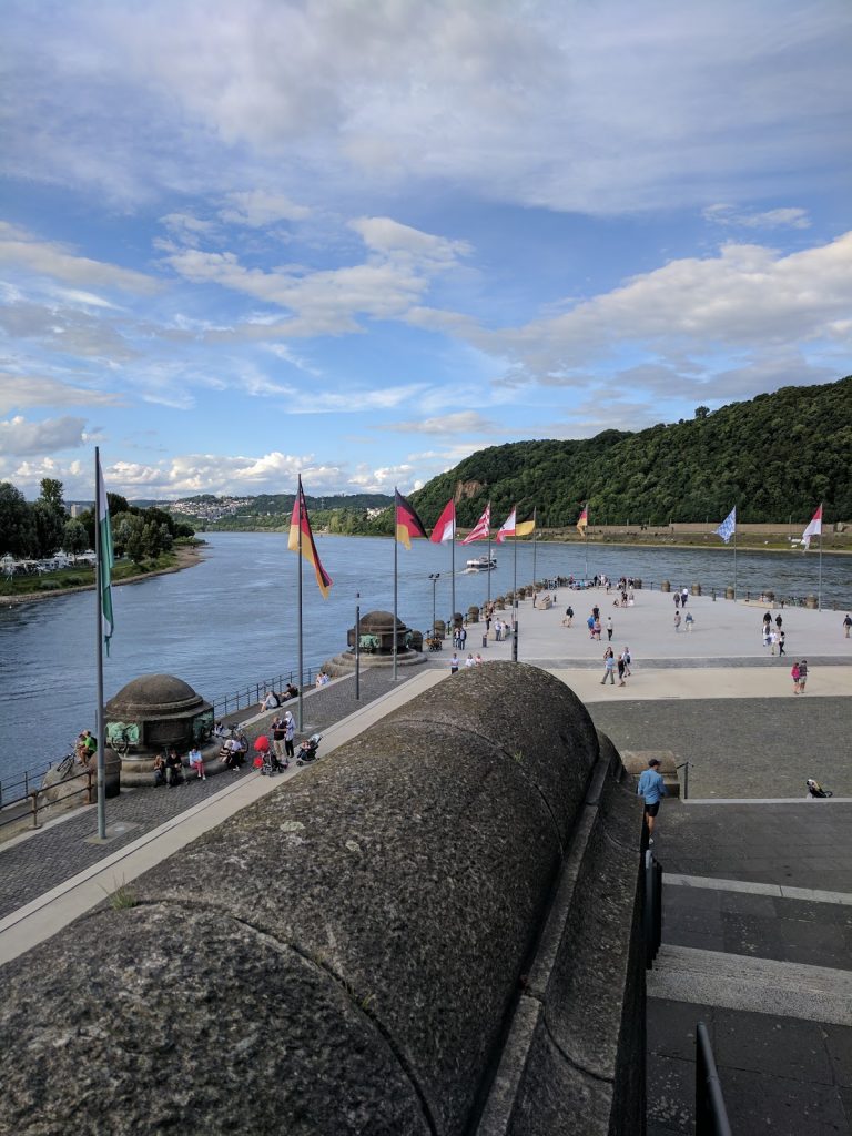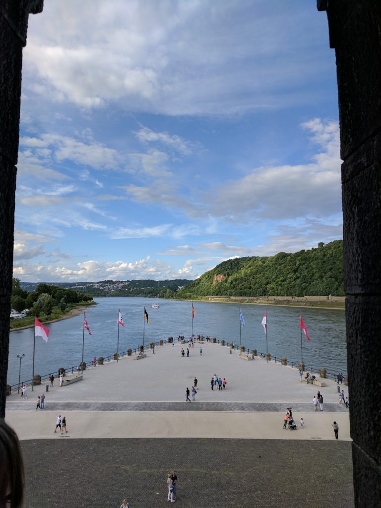 By now it was getting on to 5.00pm. We found the trail-head and walked back down into town, before heading to the station to catch the train to Koblenz. Koblenz is the town at the junction of the Rhine and Mosel rivers, so when we got there we caught a taxi to that sport, called Deutsches Eck. It has been made into a beautiful parkland to honour these two great German rivers, and there were people everywhere.