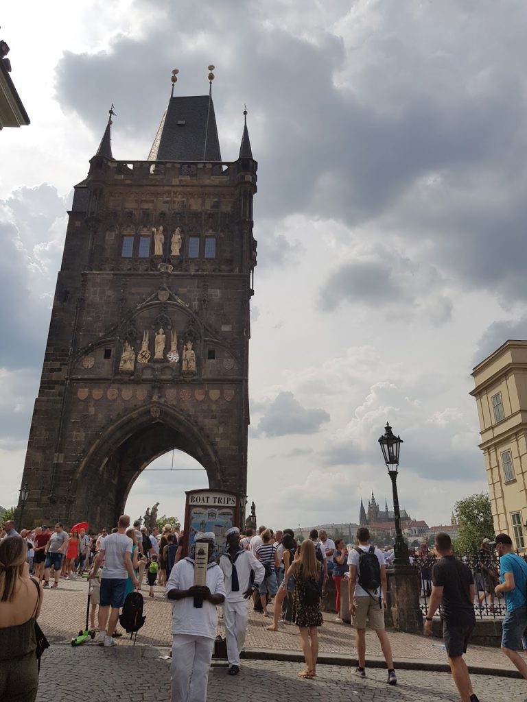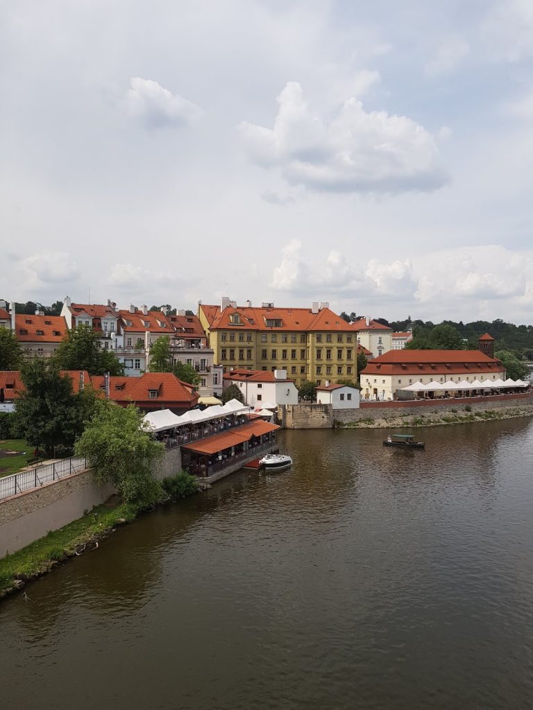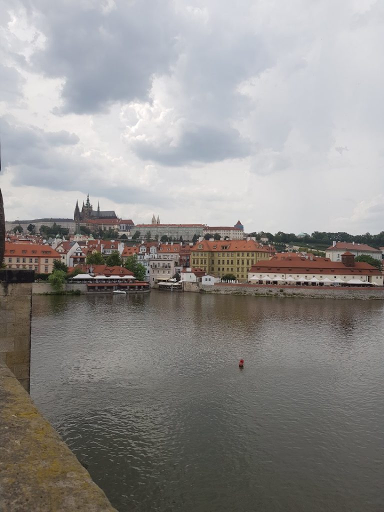 We crossed the river and turned right towards the Franz Kafka museum. We walked down into the “Narrowest street of Prague”, which is so narrow that only one person can traverse at a time. And nearby we stopped to look at the Piss Sculpture and get some photos back towards the bridge. Prague really is a beautiful city.