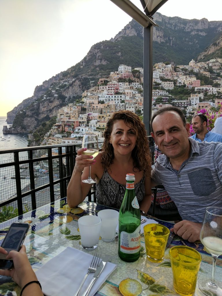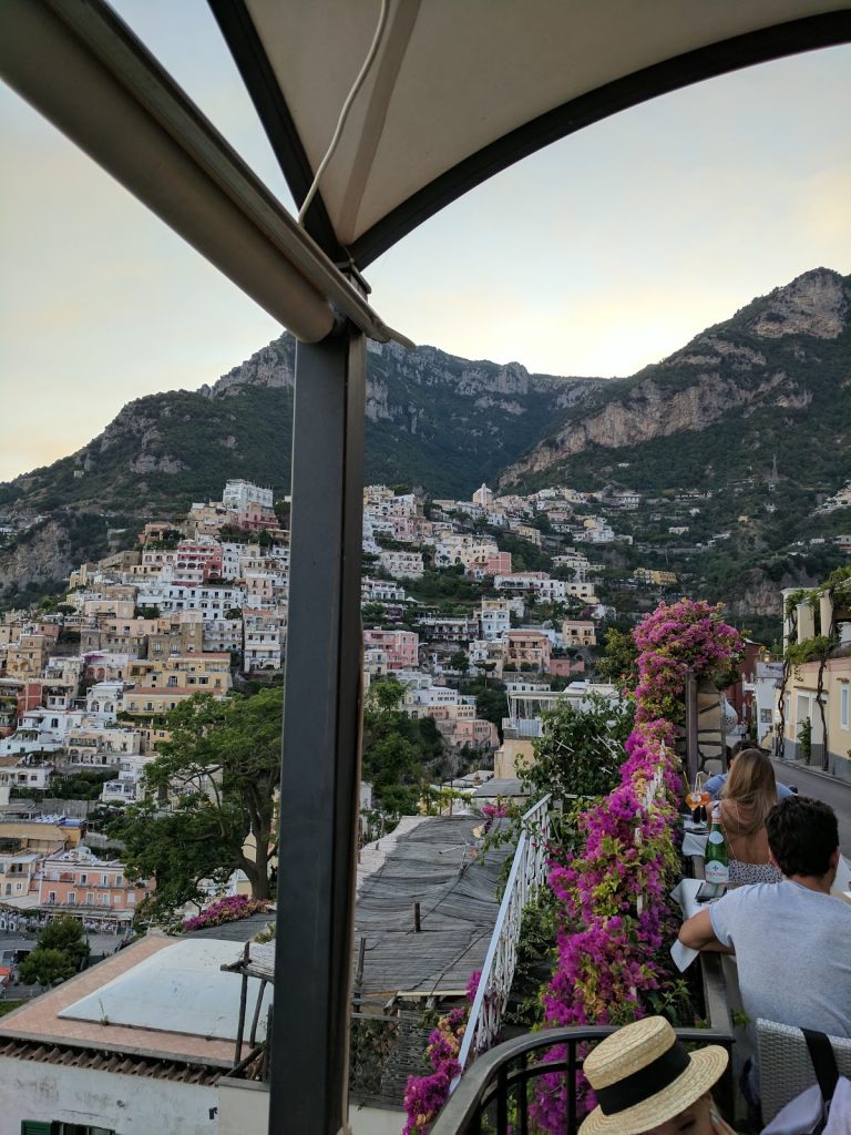 We had a swim and sun-bathed for a while then headed up to the main road to wait for the next bus. The driver let us on, but it was packed. The roads are treacherous enough, but this made it really interesting. When we arrived at our hotel, we showered and changed then headed into town for our last dinner in Positano.