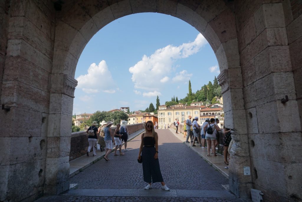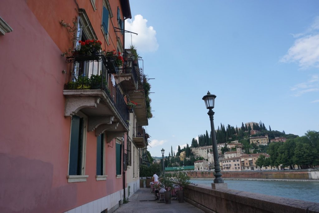 As we walked towards the river, the crowds dwindled out and we were able to enjoy the ambiance. Verona really is beautiful. Walking along the river we discovered a little bar, Terrazza Bar al Ponte, so we stopped for a drink. We then walked over to the old bridge, Ponte Petra with a view of Castel San Pietro.