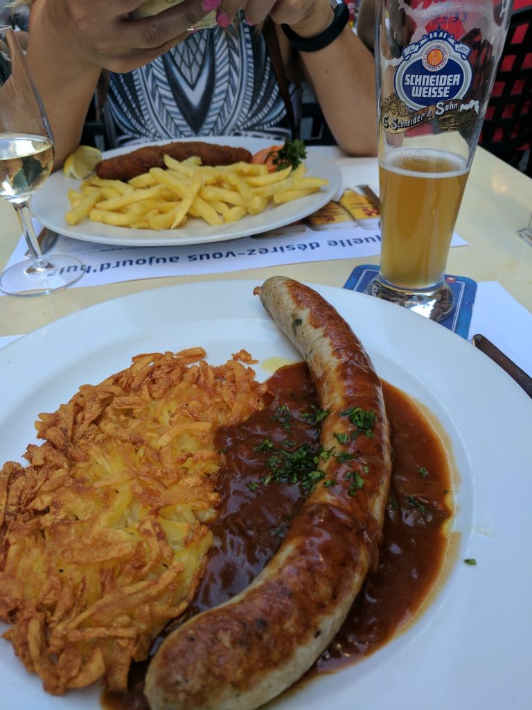 Finally, we walked all the way to the end of the Platzspitz past the national museum, then back to the hotel to prepare for dinner. We went to the old town to a local pub, the Johanniter. I had a wurst with frites – when in Switzerland…